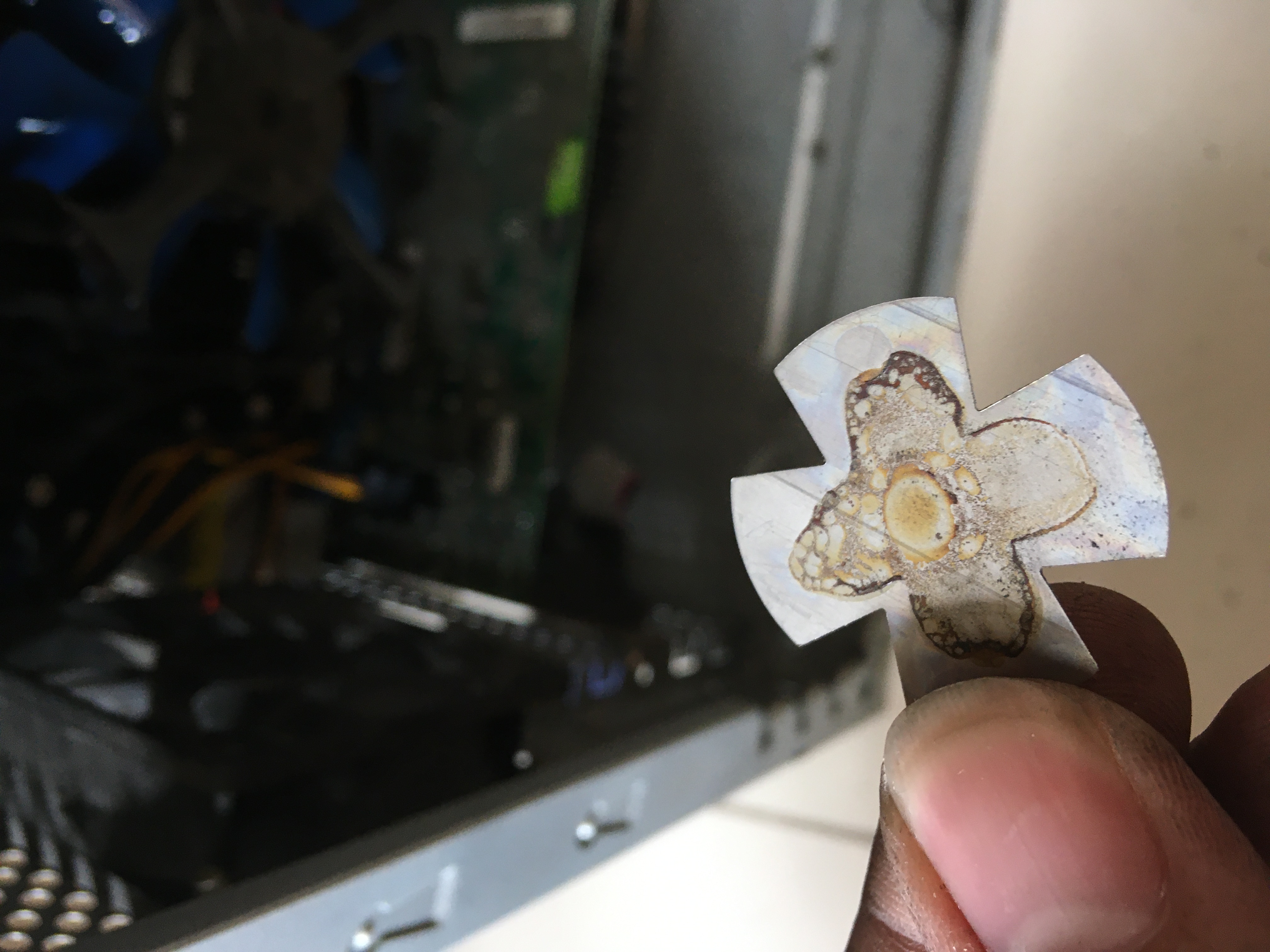 Есть (был) красивенький вентилятор DeepCool со стальной пластинкой. Которая была ТУПО приклеена к процессорному кулеру. И судя по всему от перегрева или времени отвалилась. Как раз на видюху снизу. А так-как это именно, что металлическая херня и вполне проводимая, то и замкнуло