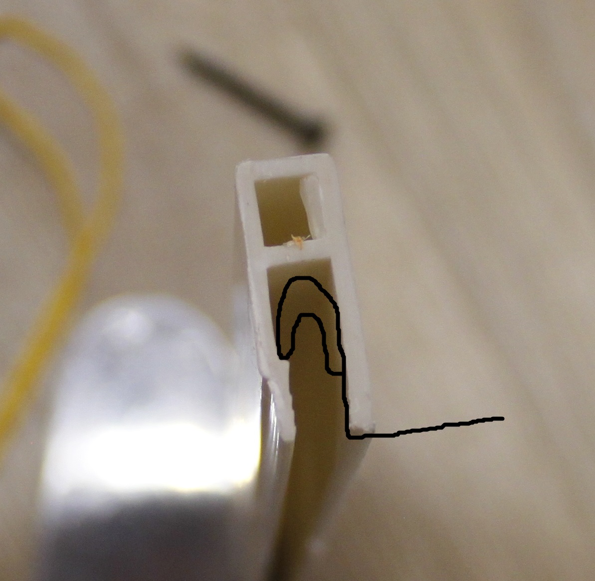 Я пририсовал потолок, и гарпун, чтобы было понятно как он там крепится. Обратите внимание, сторона с выступом предназначена для крепления к стене.