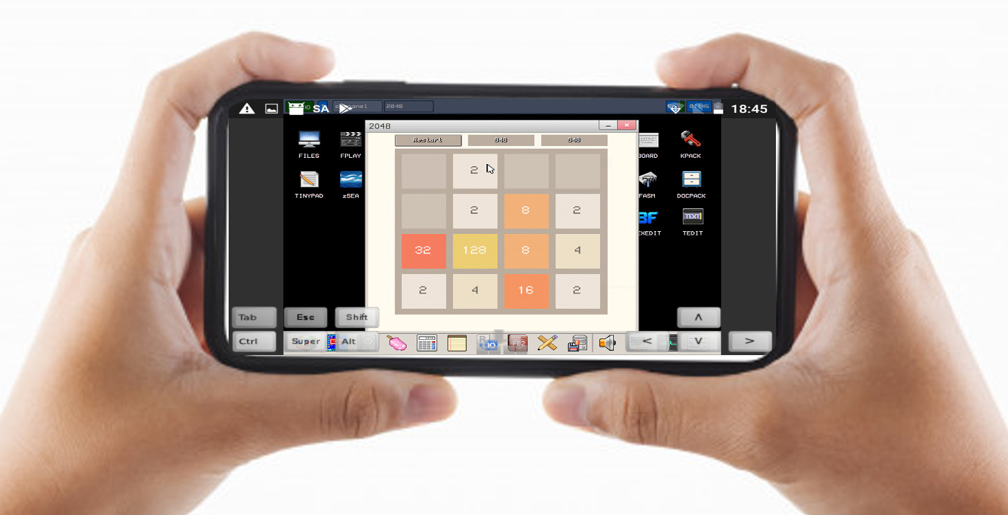 На снимке игра "2048", запущенная в виртуальной машине с 16 мегабайтами оперативной памяти под управлением KolibriOS. Удаленный доступ осуществляется по протоколу VNC с помощью приложения bVNC под Android.