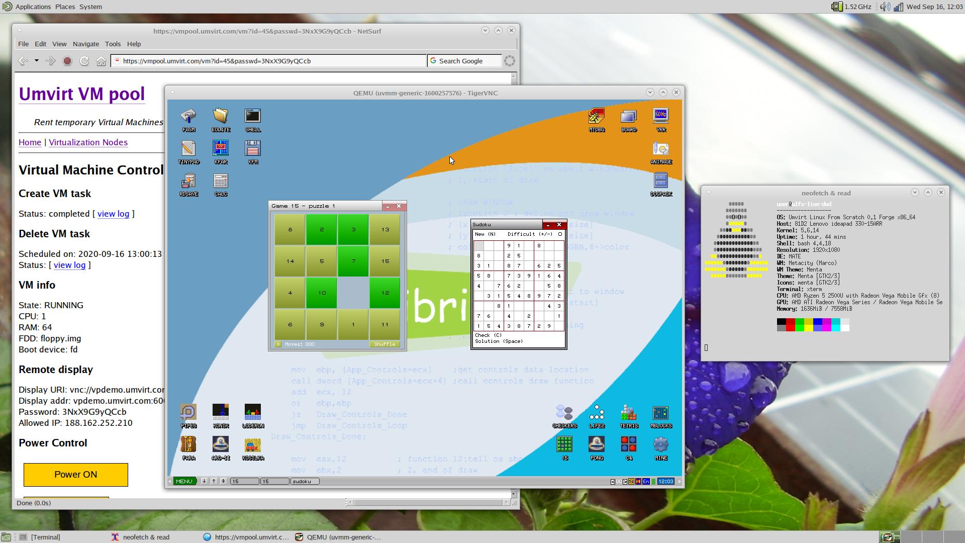 Запустил в тестовую эксплуатацию сервис для запуска временных виртуальных машин vmpool.umvirt.com. Сервис работает на базе Linuxa из говна и палок.