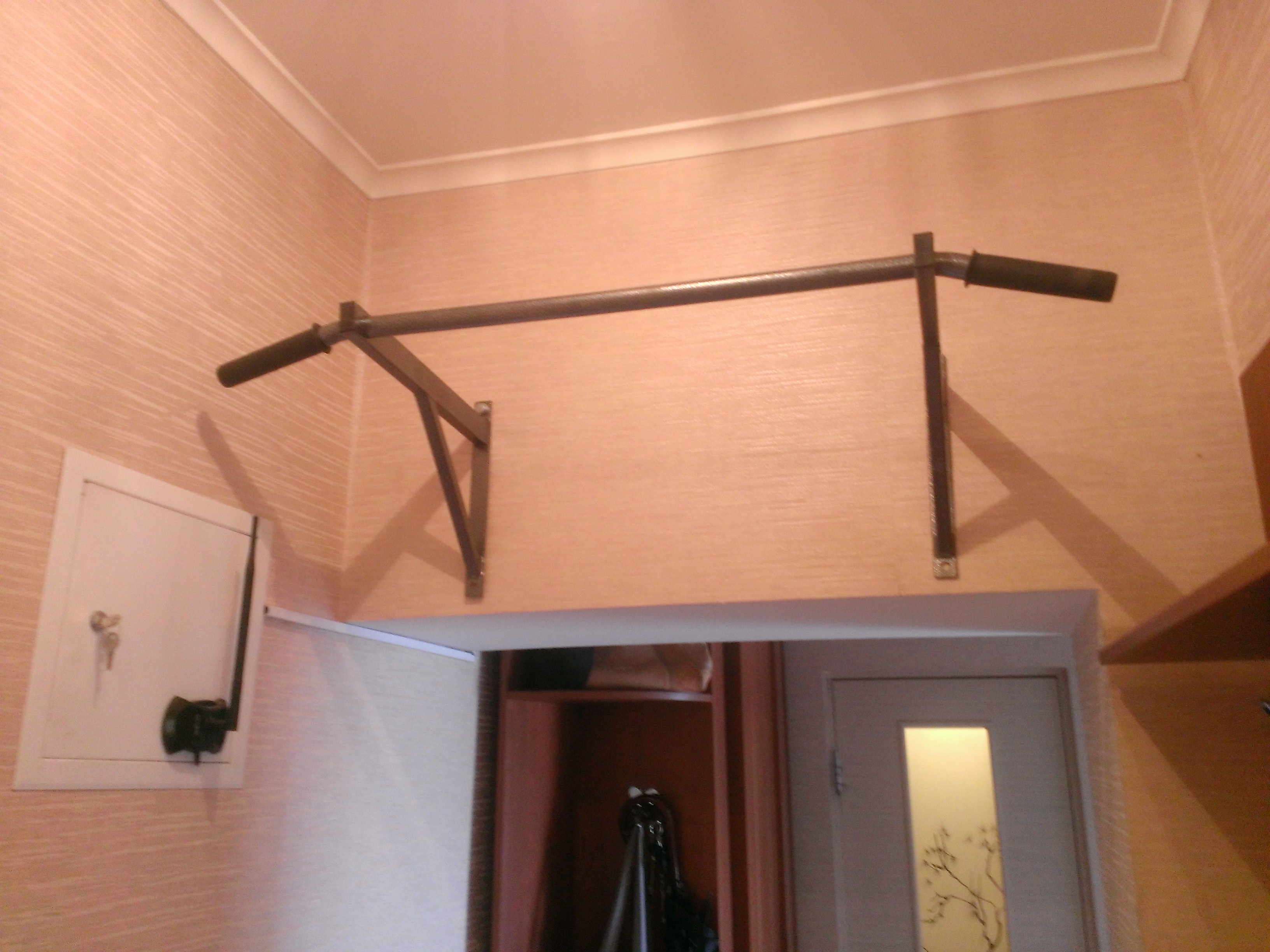 Ну и начал на нём висеть. И косплеить русскую народную пословицу - "висит груша, нельзя скушать" Теперь далее - стоит турник 2500 (это я ещё самый дешёвый взял). Что ИМХО нереально дорого. В следующий раз я лучше закуплю труб и сам сварю такое (тут дааа, сам поленился). Если кто-то вам предлагает крепить в дверной проём, то смело обосыте ему лицо (как геолог), единственное если они у вас нереально высокие и вы можете держаться на нём потом не касаясь пола с вытянутыми руками. В дверном проёме вы будете либо постоянно держать колени согнутыми + по голове получать когда проходите через него.