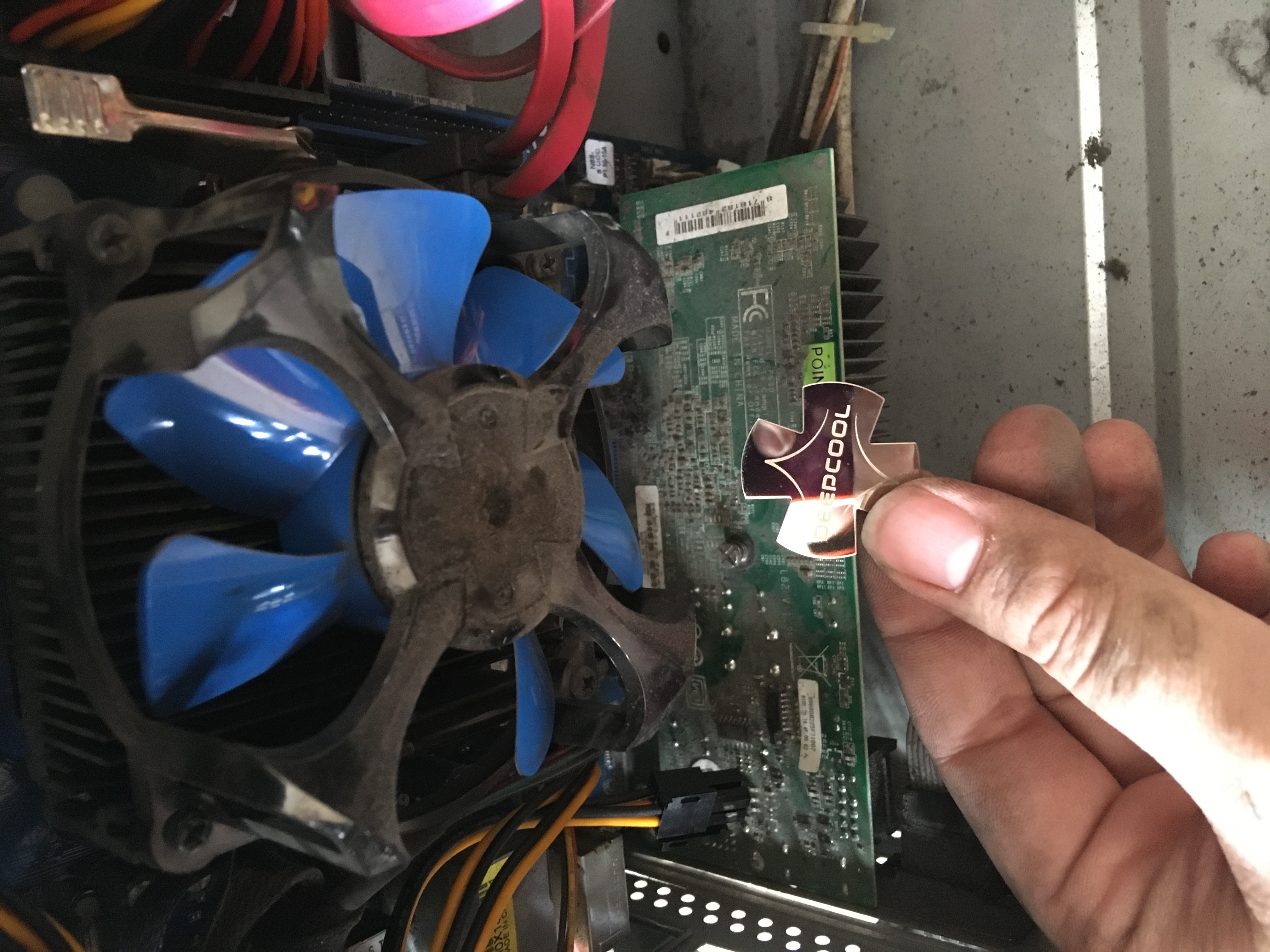 Есть (был) красивенький вентилятор DeepCool со стальной пластинкой. Которая была ТУПО приклеена к процессорному кулеру. И судя по всему от перегрева или времени отвалилась. Как раз на видюху снизу. А так-как это именно, что металлическая херня и вполне проводимая, то и замкнуло